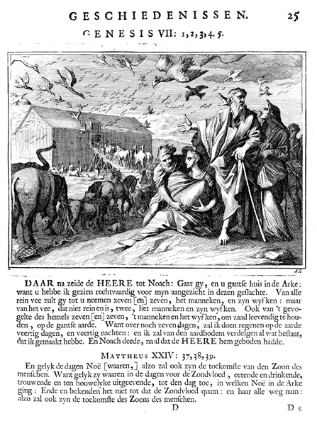 Description: Noah and his family enter the Ark, in which animals in pairs are already entering. The Dutch artist and poet Johannes Luyken (1649-1712) drew and etched this emblem and wrote the accompanying poem.