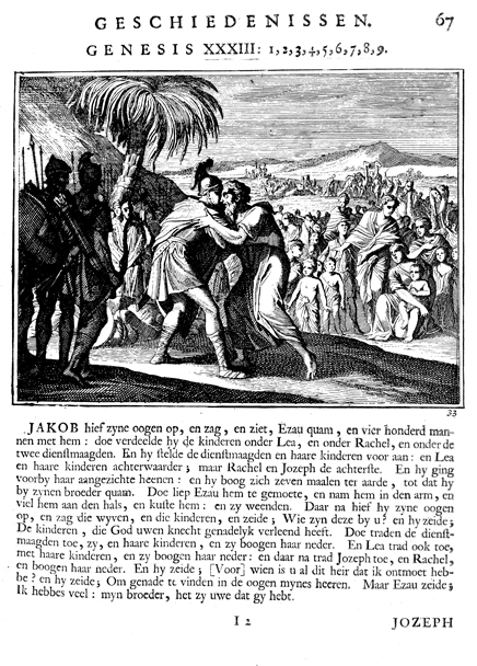 Description: The meeting of Jacob and Esau. The Dutch artist Caspar Luiken (1672-1708) drew and etched this emblem, and his father, Johannes Luyken (1649-1712), wrote the accompanying poem.