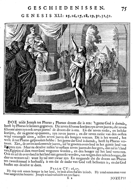 Description: Joseph interprets the dreams of the Pharaoh. The Dutch artist Caspar Luiken (1672-1708) drew and etched this emblem, and his father, Johannes Luyken (1649-1712), wrote the accompanying poem.