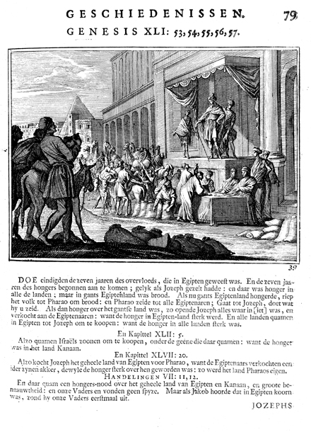 Description: Joseph sells grain. The Dutch artist Caspar Luiken (1672-1708) drew and etched this emblem, and his father, Johannes Luyken (1649-1712), wrote the accompanying poem.