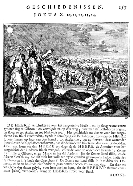 Description: Joshua makes the sun and the moon stand still. The Dutch artist Caspar Luiken (1672-1708) drew and etched this emblem, and his father, Johannes Luyken (1649-1712), wrote the accompanying poem.