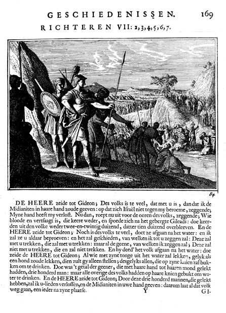 Description: Gideon makes his men drink. The Dutch artist Caspar Luiken (1672-1708) drew and etched this emblem, and his father, Johannes Luyken (1649-1712), wrote the accompanying poem.