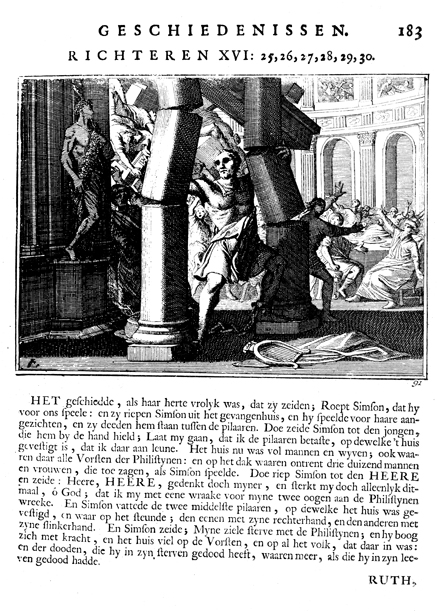 Description: Samson makes the pillars of Dagon fall down. The Dutch artist Caspar Luiken (1672-1708) drew and etched this emblem, and his father, Johannes Luyken (1649-1712), wrote the accompanying poem.