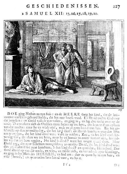 Description: David lying on the ground in sackcloth during the illness of the child of Bathsheba. The Dutch artist Caspar Luiken (1672-1708) drew and etched this emblem, and his father, Johannes Luyken (1649-1712), wrote the accompanying poem.