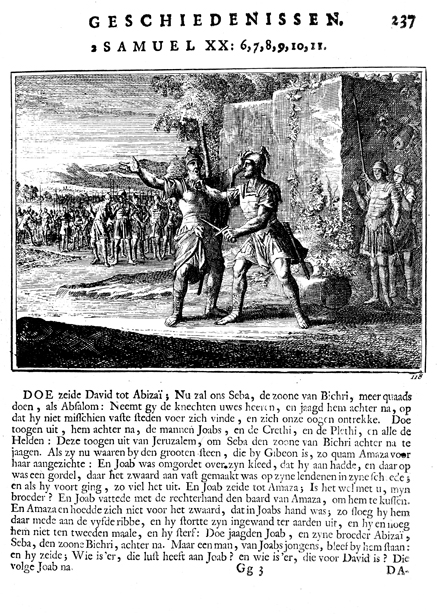 Description: Amasa is killed by Joab. The Dutch artist Caspar Luiken (1672-1708) drew and etched this emblem, and his father, Johannes Luyken (1649-1712), wrote the accompanying poem.