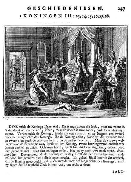 Description: Solomon’s first judgment. The Dutch artist Caspar Luiken (1672-1708) drew and etched this emblem, and his father, Johannes Luyken (1649-1712), wrote the accompanying poem.