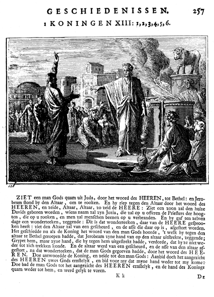 Description: The man of God from Judah prophesies against the altar on which Jeroboam carries on the worship of calves. The Dutch artist Caspar Luiken (1672-1708) drew and etched this emblem, and his father, Johannes Luyken (1649-1712), wrote the accompanying poem.