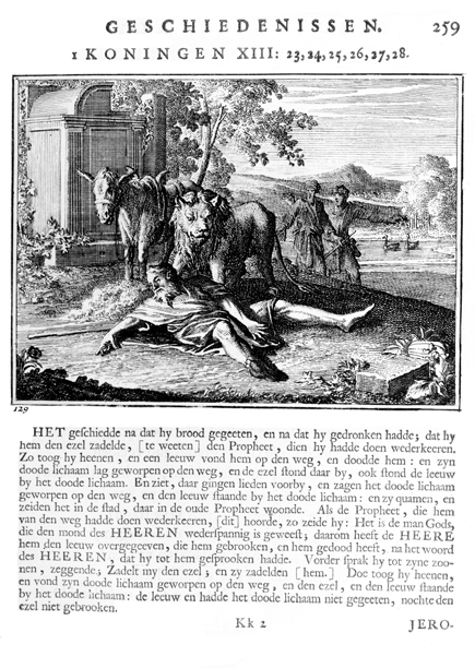 Description: The man of God from Judah on his return journey is killed by a lion. The Dutch artist Caspar Luiken (1672-1708) drew and etched this emblem, and his father, Johannes Luyken (1649-1712), wrote the accompanying poem.