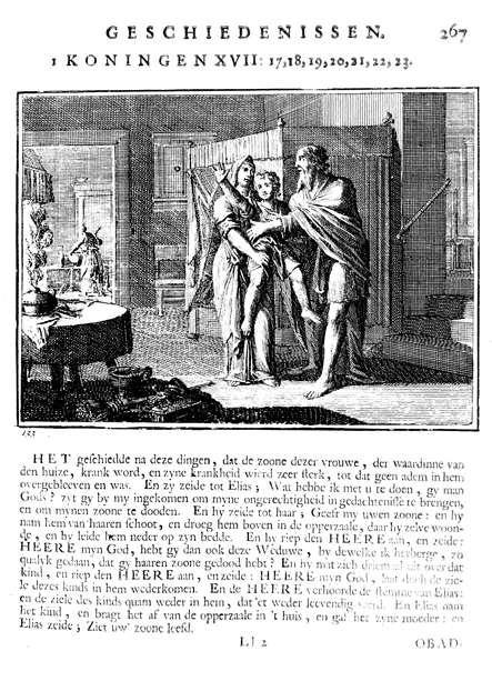 Description: The Dutch artist Caspar Luiken (1672-1708) drew and etched this emblem, and his father, Johannes Luyken (1649-1712), wrote the accompanying poem. Elijah gives the resuscitated child back to his mother.