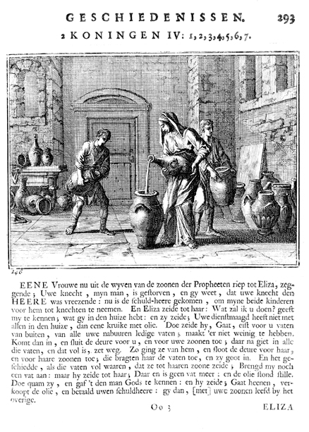 Description: The oil in the widow’s jar is, upon the word of Elisha, miraculously increased. The Dutch artist and poet Johannes Luyken (1649-1712) drew and etched this emblem and wrote the accompanying poem.