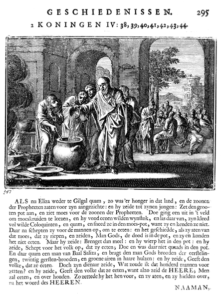 Description: Elisha turns the poisoned pot of stew into good food. The Dutch artist and poet Johannes Luyken (1649-1712) drew and etched this emblem and wrote the accompanying poem.