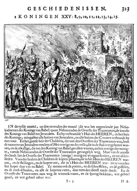 Description: The abduction of Judah from the burning Jerusalem in the Babylonian exile. The Dutch artist and poet Johannes Luyken (1649-1712) drew and etched this emblem and wrote the accompanying poem.