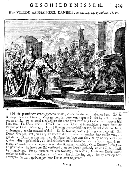 Description: Daniel kills the dragon in Babylon. The Dutch artist and poet Johannes Luyken (1649-1712) drew and etched this emblem and wrote the accompanying poem.