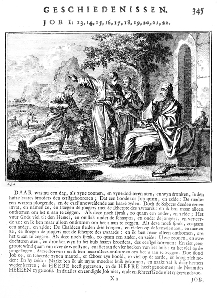 Description: Job received a number of messages, one after the other, of disasters that had befallen him. The Dutch artist and poet Johannes Luyken (1649-1712) drew and etched this emblem and wrote the accompanying poem.