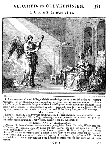 Description: The annunciation to Mary. The Dutch artist and poet Johannes Luyken (1649-1712) drew and etched this emblem and wrote the accompanying poem.