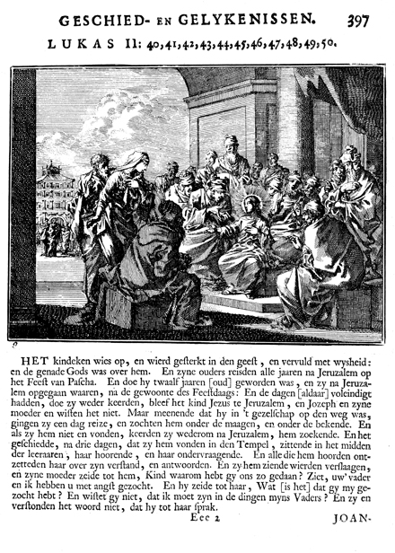 Description: The 12-year-old Jesus is found by his mother among the teachers in the Temple. The Dutch artist and poet Johannes Luyken (1649-1712) drew and etched this emblem and wrote the accompanying poem.