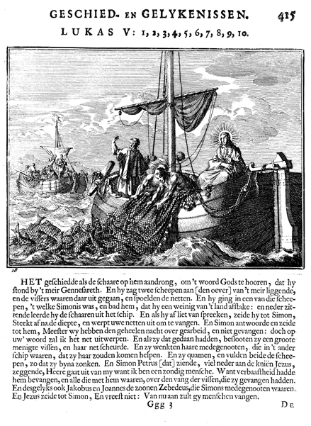 Description: Jesus, on board Simon’s boat, makes him pull up the net filled with fish. The Dutch artist and poet Johannes Luyken (1649-1712) drew and etched this emblem and wrote the accompanying poem.