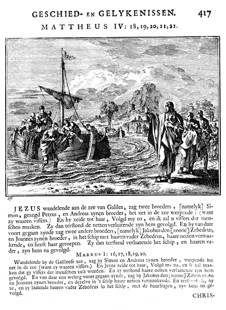 Description: Jesus, followed by Peter and Andrew, beckons James and John to come from their father’s boat. The Dutch artist and poet Johannes Luyken (1649-1712) drew and etched this emblem and wrote the accompanying poem.