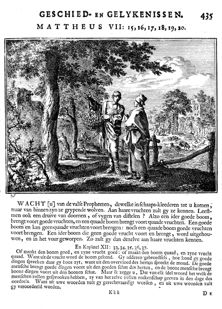 Description: Two men stand by a tree, searching for fruit. In the left background a barren tree is being cut down. The Dutch artist and poet Johannes Luyken (1649-1712) drew and etched this emblem and wrote the accompanying poem.