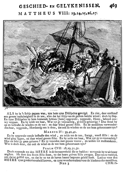 Description: Jesus, standing in the boat, orders the sea to become calm. The Dutch artist and poet Johannes Luyken (1649-1712) drew and etched this emblem and wrote the accompanying poem.
