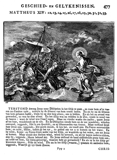 Description: Jesus, walking on the sea, raises the sinking Peter. The Dutch artist and poet Johannes Luyken (1649-1712) drew and etched this emblem and wrote the accompanying poem.
