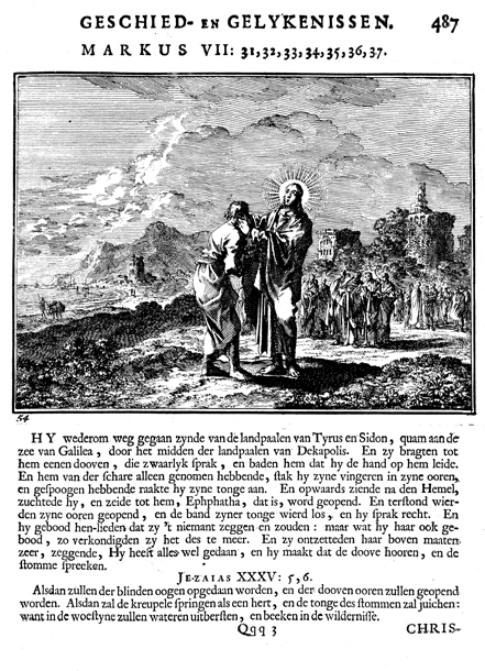 Description: Jesus heals a deaf man, who could barely speak, by touching his ears. The Dutch artist and poet Johannes Luyken (1649-1712) drew and etched this emblem and wrote the accompanying poem.