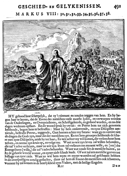Description: Jesus scolds Peter, who placed himself in front of Jesus, and beckons him to walk behind him. The Dutch artist and poet Johannes Luyken (1649-1712) drew and etched this emblem and wrote the accompanying poem.