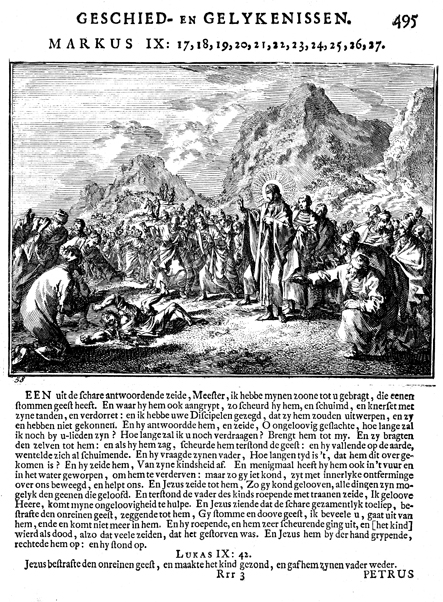 Description: Jesus heals a spirit-possessed child who is rolling around on the ground before him. The Dutch artist and poet Johannes Luyken (1649-1712) drew and etched this emblem and wrote the accompanying poem.