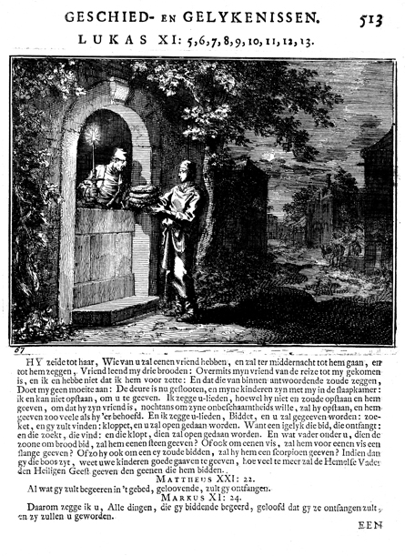 Description: The parable of the man who in the middle of the night asks his friend for three loaves of bread. The Dutch artist and poet Johannes Luyken (1649-1712) drew and etched this emblem and wrote the accompanying poem.