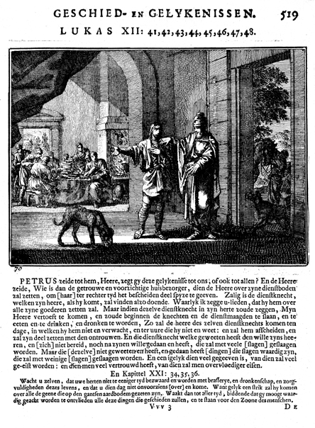 Description: The parable of the faithful house steward, who receives his master at his unexpected arrival. The Dutch artist and poet Johannes Luyken (1649-1712) drew and etched this emblem and wrote the accompanying poem.