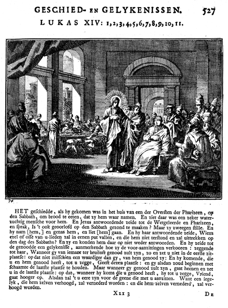 Description: Jesus heals a man with dropsy. The Dutch artist and poet Johannes Luyken (1649-1712) drew and etched this emblem and wrote the accompanying poem.