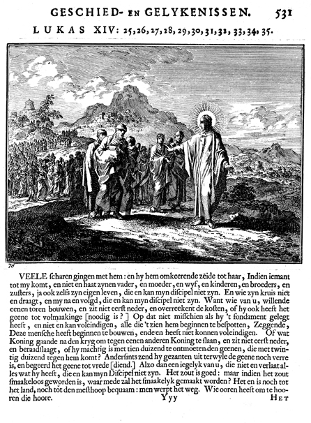 Description: Jesus stands on the right and turns to his many followers coming from the left. The Dutch artist and poet Johannes Luyken (1649-1712) drew and etched this emblem and wrote the accompanying poem.