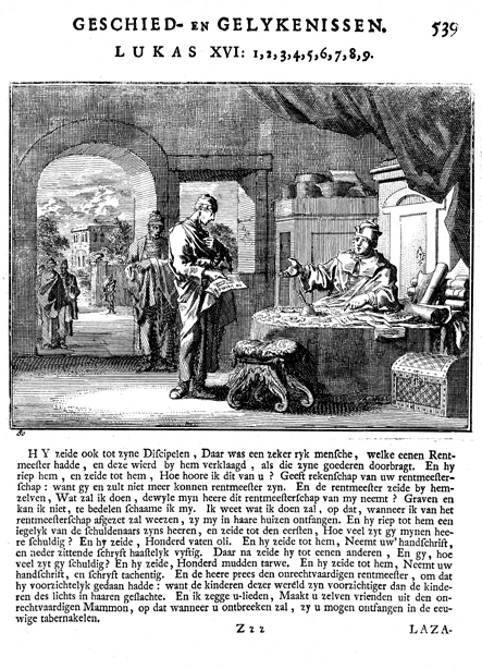 Description: The parable of the dishonest steward, who sent for his master’s debtors. The Dutch artist and poet Johannes Luyken (1649-1712) drew and etched this emblem and wrote the accompanying poem.