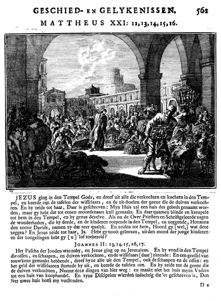Description: Jesus drives the buyers and sellers from the Temple. The Dutch artist and poet Johannes Luyken (1649-1712) drew and etched this emblem and wrote the accompanying poem.