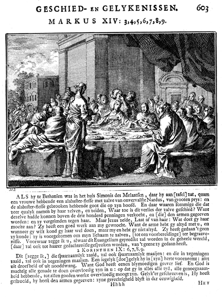 Description: The meal at Simon the leper’s house, where the expensive balm is poured on the head of Jesus. The Dutch artist and poet Johannes Luyken (1649-1712) drew and etched this emblem and wrote the accompanying poem.