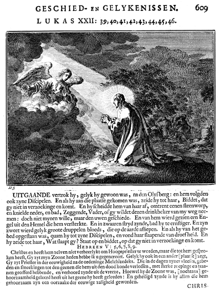 Description: Jesus praying in Gethsemane. The Dutch artist and poet Johannes Luyken (1649-1712) drew and etched this emblem and wrote the accompanying poem.
