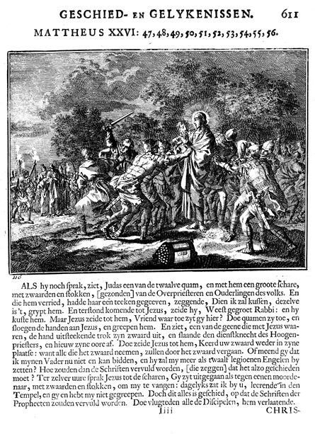 Description: Jesus seized by the soldiers; to the left of that group, Peter struggles with Malchus. The Dutch artist and poet Johannes Luyken (1649-1712) drew and etched this emblem and wrote the accompanying poem.