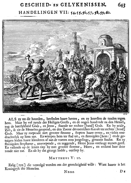 Description: The stoning of Stephen. The Dutch artist and poet Johannes Luyken (1649-1712) drew and etched this emblem and wrote the accompanying poem.