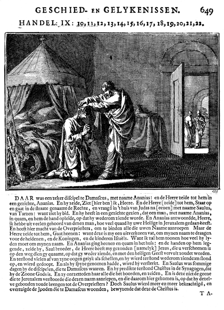 Description: Ananias comes upon the praying Saul and places his hands on Saul’s head. The Dutch artist and poet Johannes Luyken (1649-1712) drew and etched this emblem and wrote the accompanying poem.