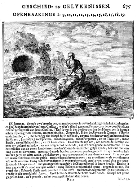 Description: John the Evangelist sitting on the beach on the island of Patmos. The Dutch artist and poet Johannes Luyken (1649-1712) drew and etched this emblem and wrote the accompanying poem.