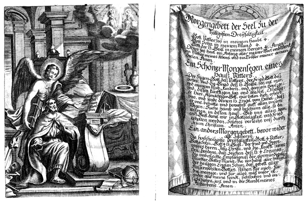 Description: This two page frontispiece features an illustration on the left side and the text of three morning prayers written on an ornate drapery on the right. In the illustration, a man (possibly the author, Maximilian Gandolph von Künburg) kneels before an altar bearing an open book inscribed with Luther’s German translation of Psalm 51:15: “Herr, tue meine Lippen auf, daß mein Mund deinen Ruhm verkündige,” or, “Open my lips, Lord, and my mouth will declare your praise.” An angel appears behind and above the man gesturing to the book with one hand and holding a large volume with the other. An axillary sphere or globe, piece of parchment, and several books are scattered around the floor, and to the right of the frame a metal censer and incense boat sit on a table dressed with cloth. God the Father, Jesus holding a cross, and a cherub-like holy spirit appear in the upper right corner amidst clouds and rays of sunlight looking down on the scene below.