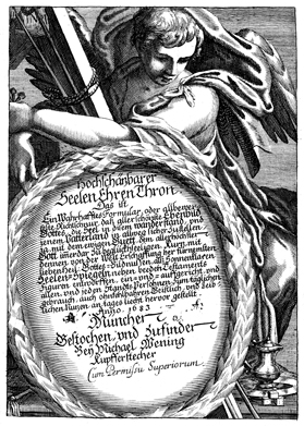 Description: This frontispiece features a German inscription framed by a laurel wreath in the shape of a shield. Behind the wreathed text, an angel embraces a cross and grips nails in one hand as he gazes downward at the words. A pitcher or metal censer stands slightly behind three stacked dice in the bottom right-hand corner.