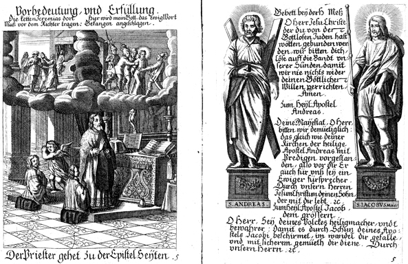 Description: On the left: Saint Carlo Borromeo stands and prays before the altar, an angel to one side. Above to the left, Jeremiah is rejected by other Israelites. Above to the right, an official strikes Jesus for speaking against the high priest. On the right: Saint Andrew and Saint Jacob stand on plinths. Andrew holds his X-shaped, the symbol of his martyrdom cross behind him, a small book in his hand. Jacob the patriarch holds a staff in one hand.