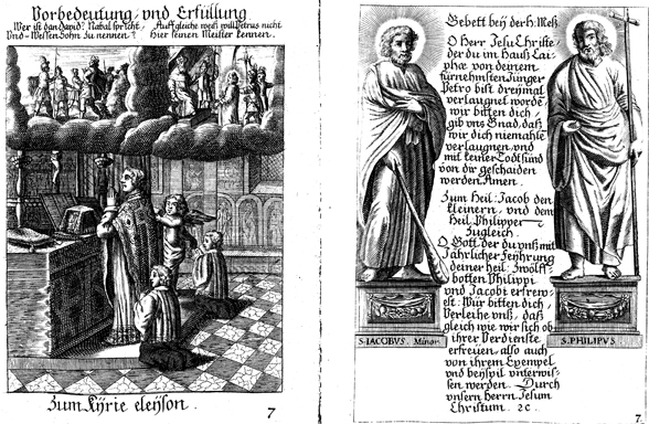 Description: On the left: Carlo Borromeo stands and prays at the altar, joined by an angel. In the upper left, Nabal asks "who is David?" In the upper right, Jesus stands in chains and Peter denies him. On the right: Saint Jacob (James) the Lesser and Saint Philip stand on plinths on either side of the text. James holds a club and Philip holds a cross, symbols of their martyrdoms.