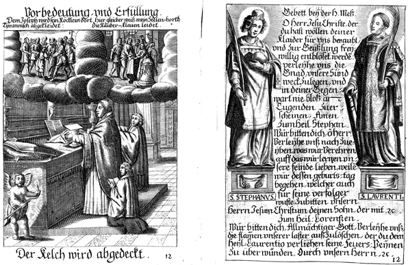 Description: On the left: Saint Carlo Borromeo removes the corporal from the chalice with pall. On the upper right Joseph's coat is taken from him. On the upper left, Jesus is flogged and his clothes are stolen from him. On the right: Saint Stephen stands holding a plume and a rock (left) and Saint Lawrence holds a feather.