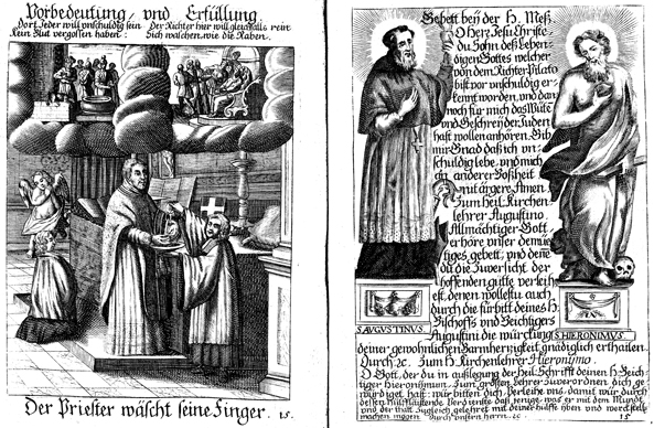 Description: On the left: Saint Carlo Borromeo washes his hands with the lavabo provided by an altar boy. On the upper left, men perform ritual abultion. On the upper right, Pilate washes his hands as Jesus is led away. On the right: on the left, Saint Augustine raises a chalice. On the right, Saint Hieronmius (Hieronymus, or Jerome)stands beside one skull and holds another, and also holds a writing case.