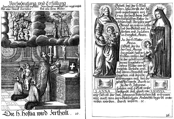 Description: On the left: Saint Carlo Borromeo breaks the host over the chalice. On the upper left, Samson destroys the temple of Dagon. On the upper right, the Beloved Disciple and the Virgin Mary stand below Jesus on the cross. On the right: on the left, Saint Anna stands with a protective hand around (presumably) the child Mary, who points to a book. On the right, Saint Joanna stands with a crucifix and the child Mary (?). She is crowned and wearing a medieval nun's habit.