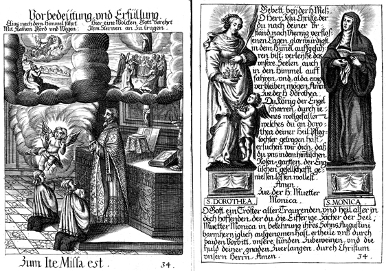Description: On the left: Saint Carlo Borromeo prays with an angel. Above on the left, Elijah ascends to heaven in a chariot while Elisha looks on. Above on the right, Jesus ascends to heaven while the disciples look on. On the right: on the left, .