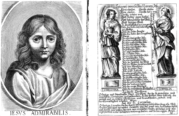 Description: On the left: a portrait of a young boy. On the right: Saint Christina of Bolsena stands on a plinth holding a snake and palm, symbols of her martyrdom. On the right, Saint Cornelia stands on a plinth holding a cross, a symbol of her martyrdom..