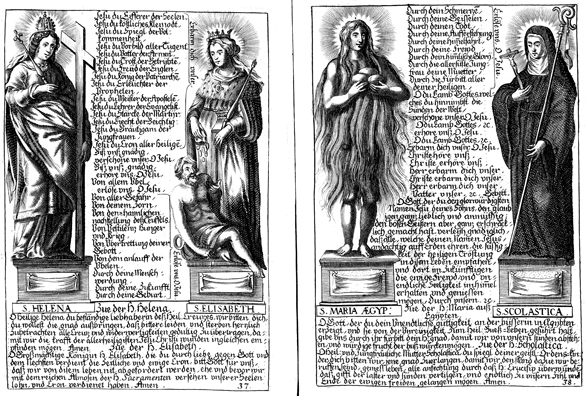 Description: On the left: Saint Helena, Empress of Rome, stands with scepter and true cross on a plinth on the left of the page. Saint Elizabeth also stands with a scepter, giving coins to a poor man at her feet. On the right: Saint Mary of Egypt stands on the left holding three loaves of bread, clothed in her hair. Saint Scolastica [sic] stands on the right in a habit, holding a crozier and crucifix.